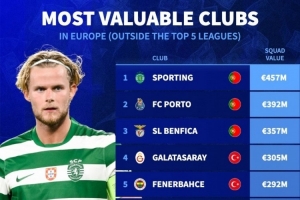 五大联赛之外欧洲俱乐部身价榜:葡萄牙体育、波尔图、本菲卡前三