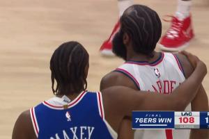 气着呢!马克西一路搂着哈登试图寒暄 哈登左右游走没心情理